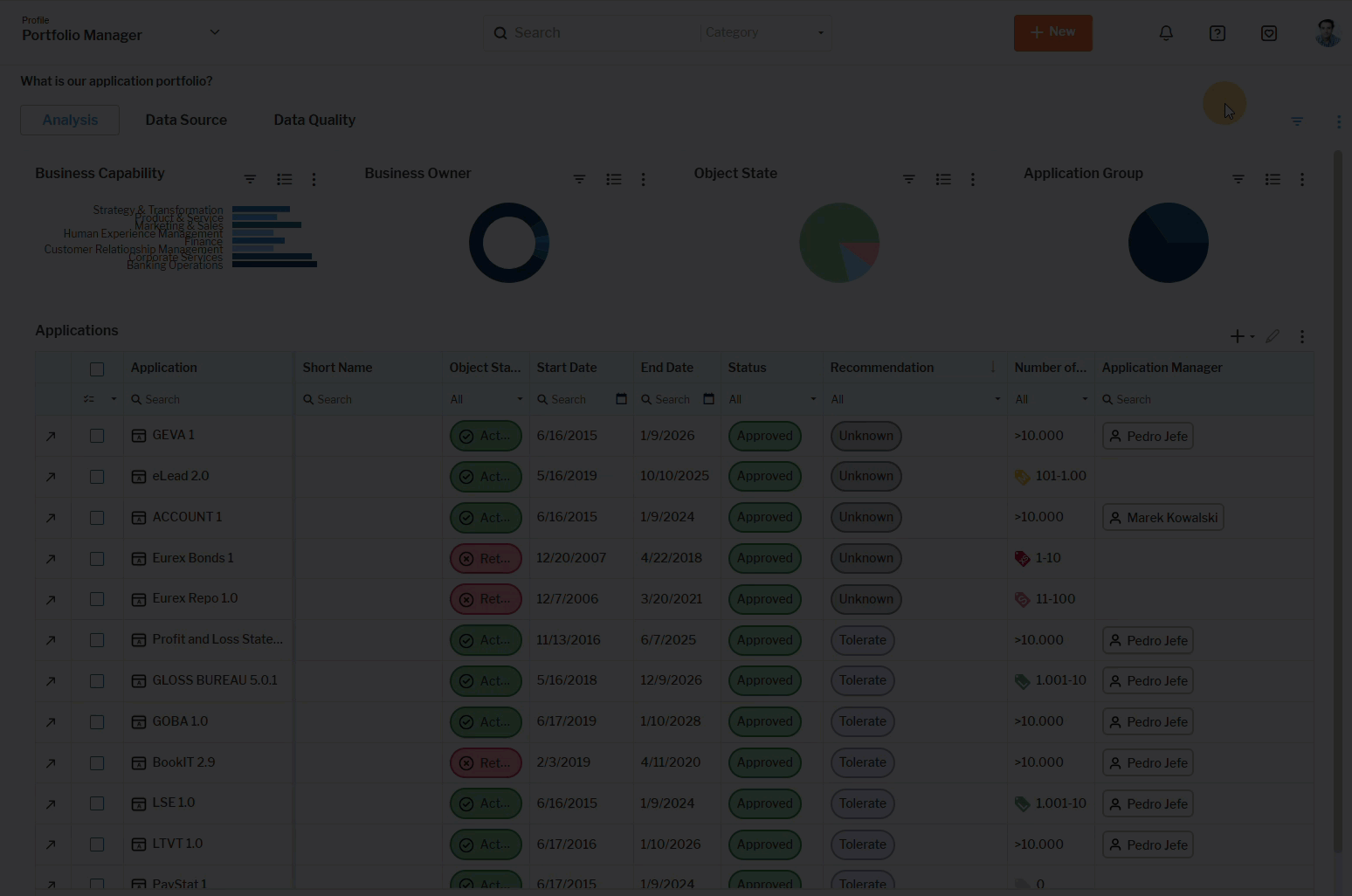 If the Object State filter is set to Active for the business question What is our application portfolio?, then only the active applications are considered in the results of the business question.