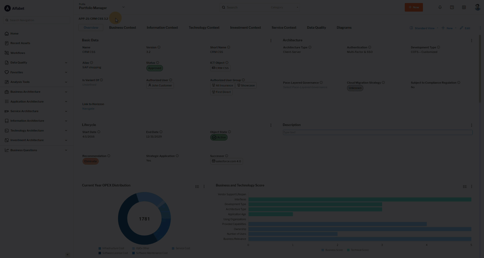 The assets that you can see in Alfabet will depend on the user profile that you access the product with. But the ability to add and edit assets depends on the authorization defined for the asset. The user who adds an asset to the repository is the authorized user by default. This can be changed at any time to another user by the current authorized user.